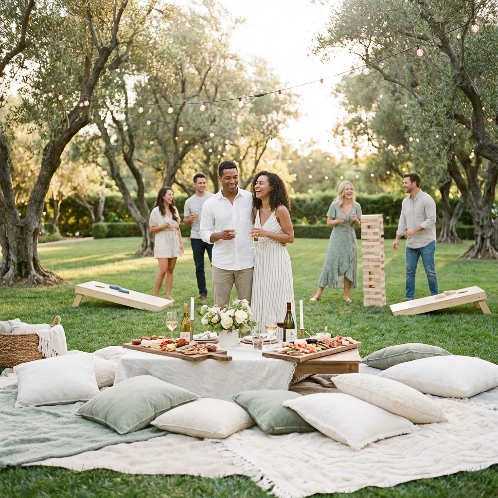 7. Garden Party with Lawn Games Transform any outdoor space with string lights, lawn games like cornhole and giant Jenga, and farm-to-table appetizers served on rustic wooden boards.