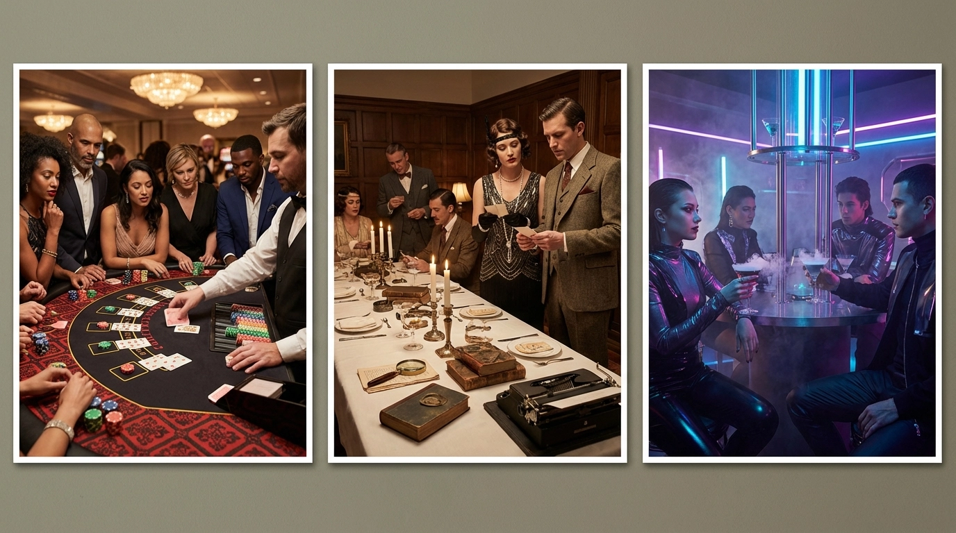 The Concept: Immersive theatrical experience where guests play characters in a murder mystery storyline. Includes costume suggestions, character assignments, and interactive gameplay throughout dinner.